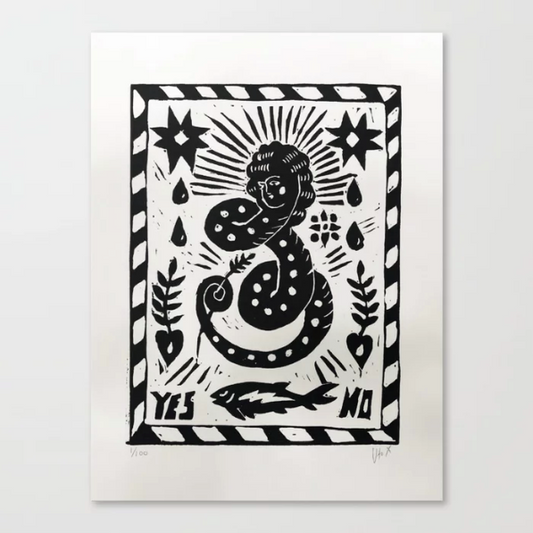 Original Signed Linocut Print | 9x12 | Folk Art | Tattoo Art | Lady Art Print | Goth Wall Decor | Witchy Art Print | Numbered Signed Print